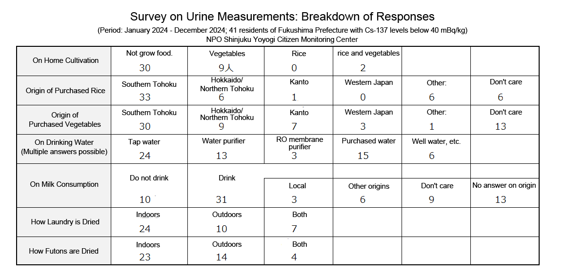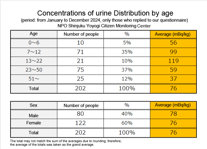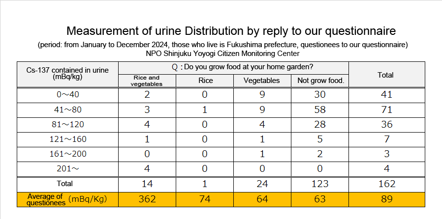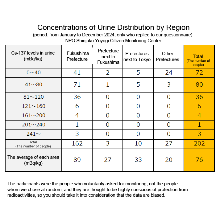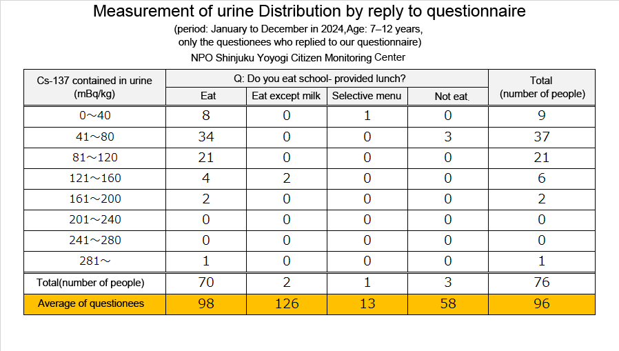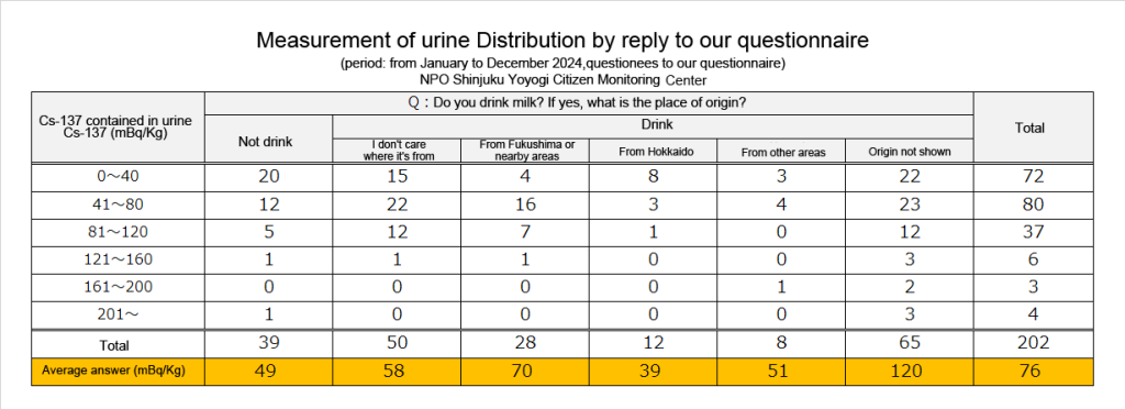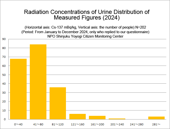 Results of concentrations of radioactive cesium in urine (2024)By adminOn 10/24/2025In 未分類We put the results of urine monitoring from January to December 2024 together. (N=202, We picked up only the first result of those who were monitored multiple times.) Below are the results of radiation measurement.PreviousResults of concentrations of radioactive cesium in milk. (2025)NextResults of concentrations of radioactive cesium in yogurt.(2025)
