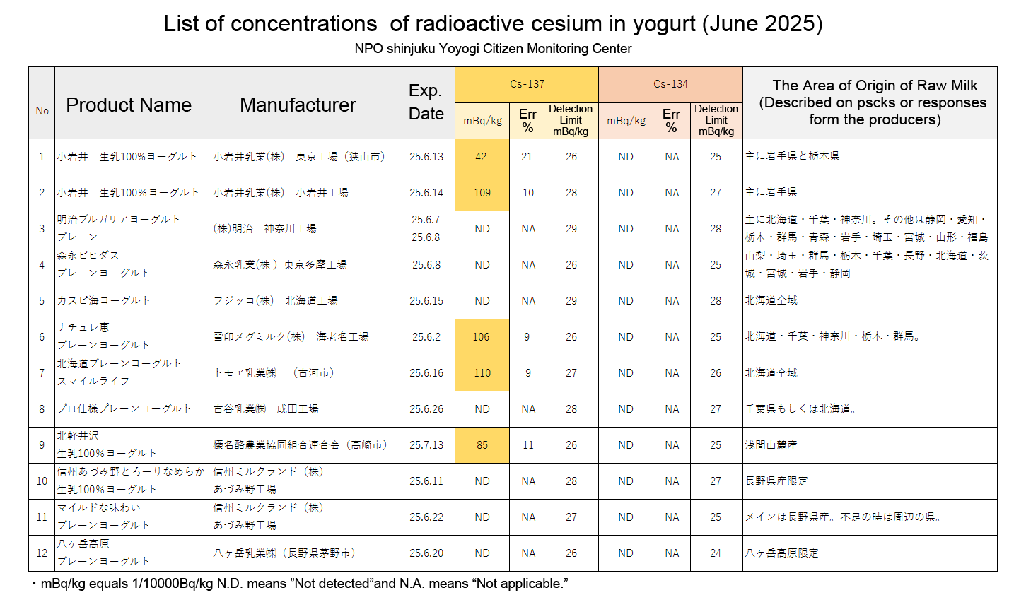 In June of this year, measurements were conducted on 12 different brands of commercially available yogurt. Below is a summary of the measurement results: