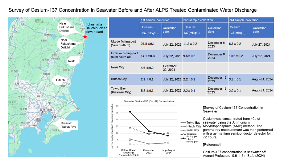 Since August 24, 2023, the discharge of treated water accumulated at the Fukushima Daiichi Nuclear Power Plant into the Pacific Ocean has begun. Therefore, in December 2023, seawater samples were collected and the concentration of cesium-137 was compared with seawater samples collected before July. This time, in July and August 2024, the third round of seawater sampling was conducted, and the results have been added.