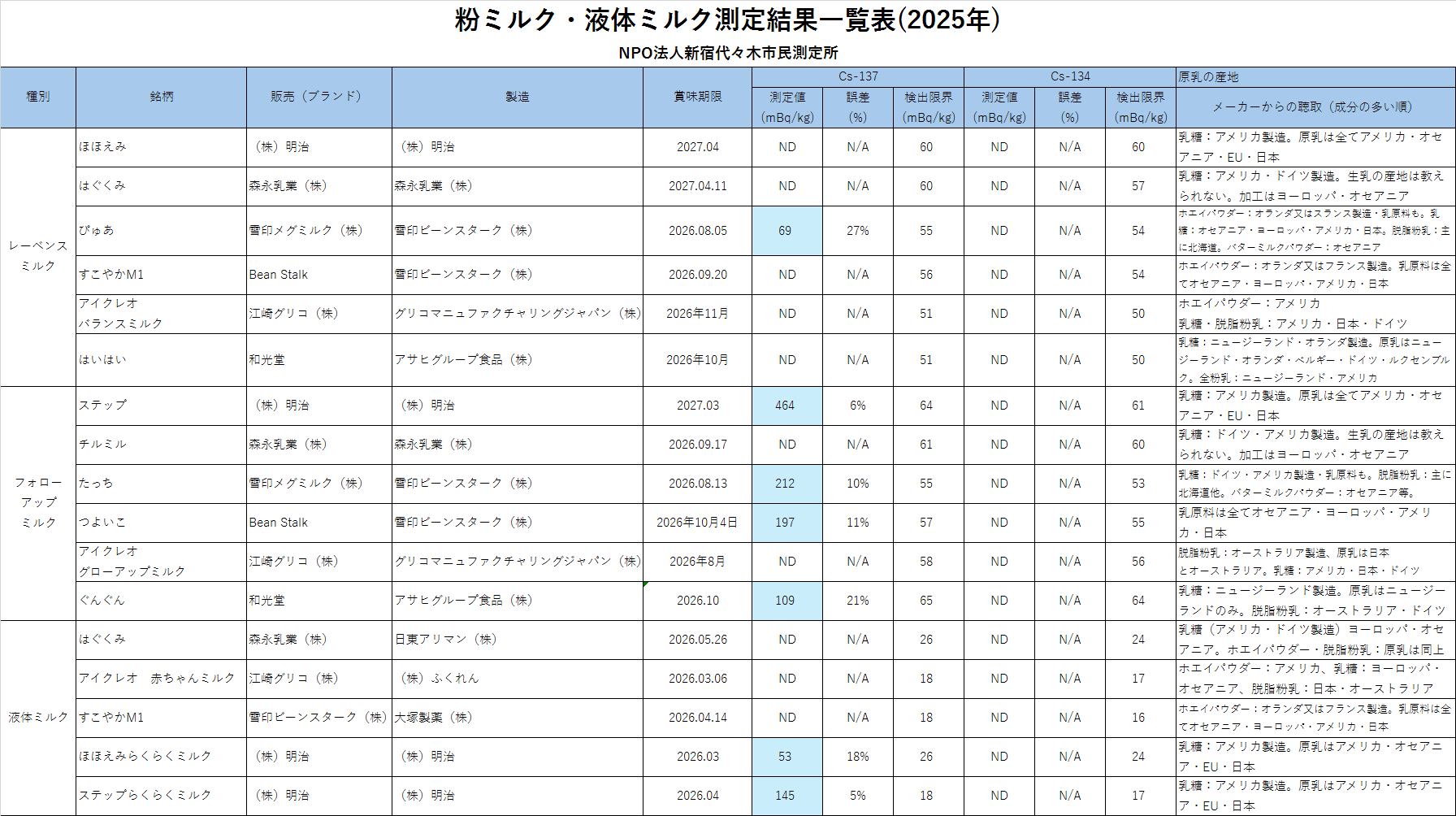 今年夏から9月にかけて粉ミルク・液体ミルクを測定しました。